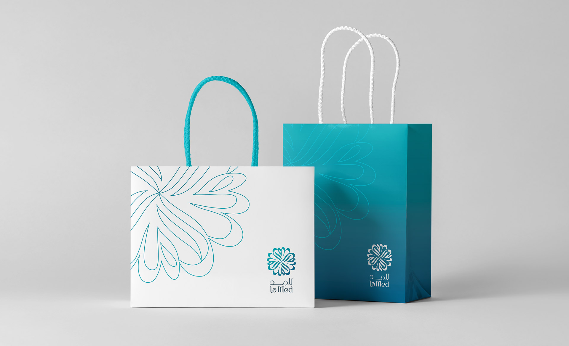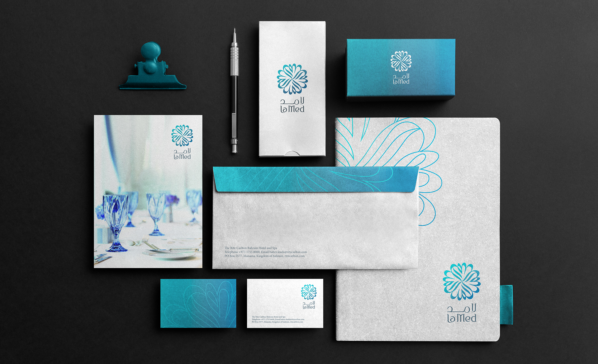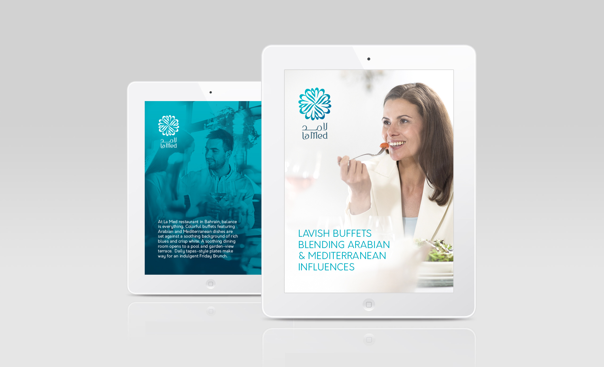 La Med Visual identity for a new upscale restaurant in the Kingdom of Bahrain. Colourful buffets featuring Arabian and Mediterranean dishes are set against a soothing background of rich blues and crisp white.